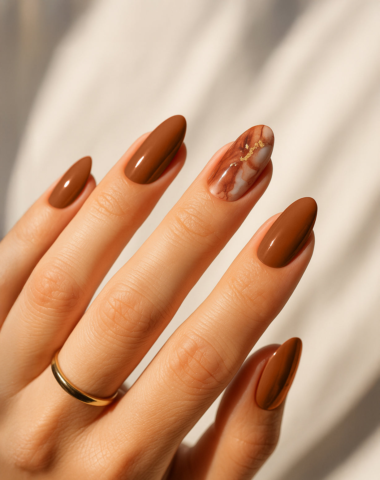 ✦ Ambra | Un effetto unico e artistico: la base calda del marrone si intreccia con venature marmorizzate che trasformano ogni unghia in un piccolo dettaglio di design.