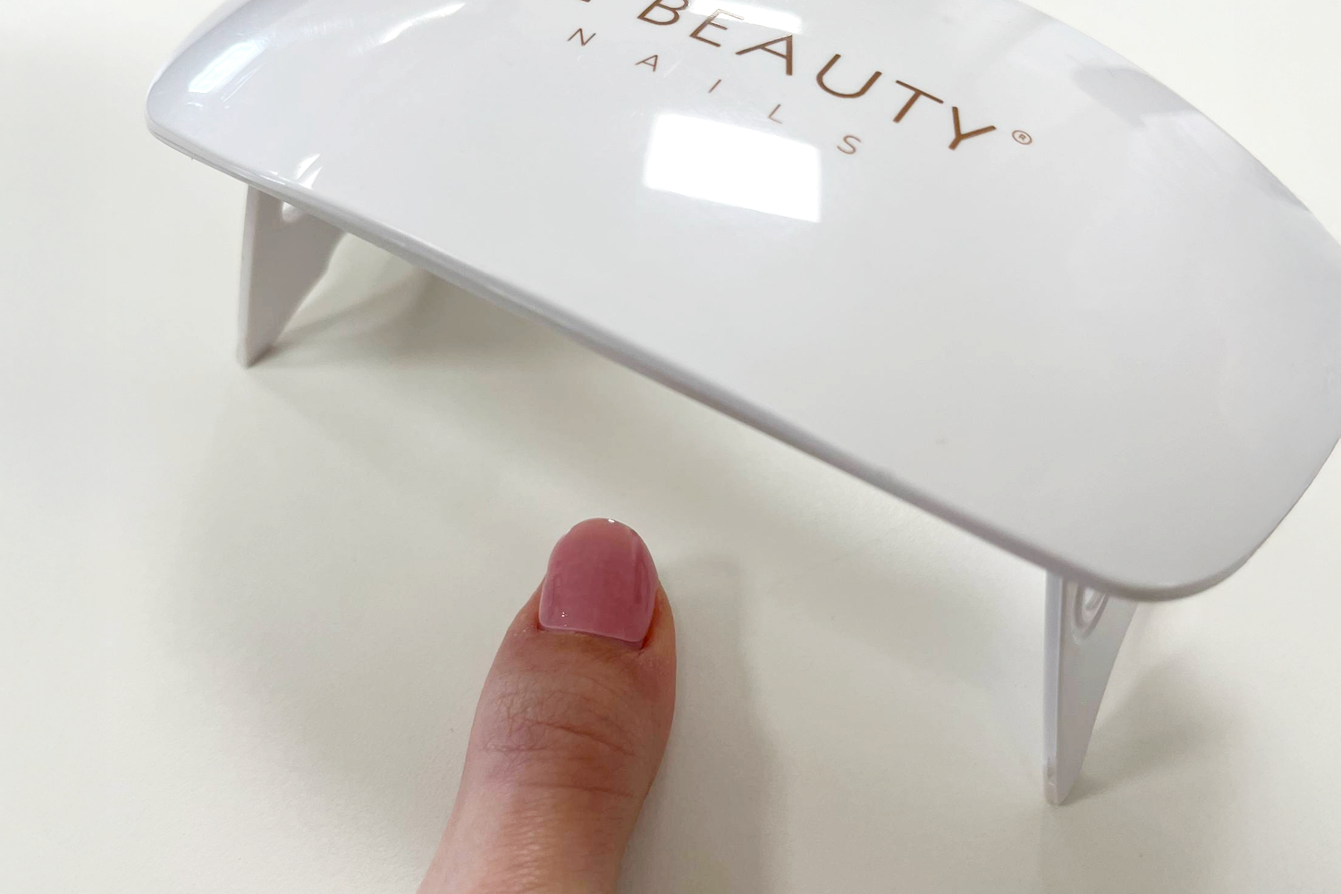 Inserisci indice, medio, anulare e mignolo sotto la lampada UV/LED e polimerizza 1 x 60 secondi. Ruota leggermente le dita a destra e sinistra per una polimerizzazione uniforme dei bordi. Ripeti lo stesso procedimento con i pollici.