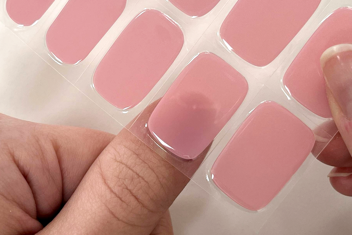 Appoggia la pellicola con le strisce sull’unghia per individuare la misura ideale. Se sei indecisa tra due misure, scegli sempre quella leggermente più piccola: eviterai che la strip tocchi la cuticola e comprometta la durata.