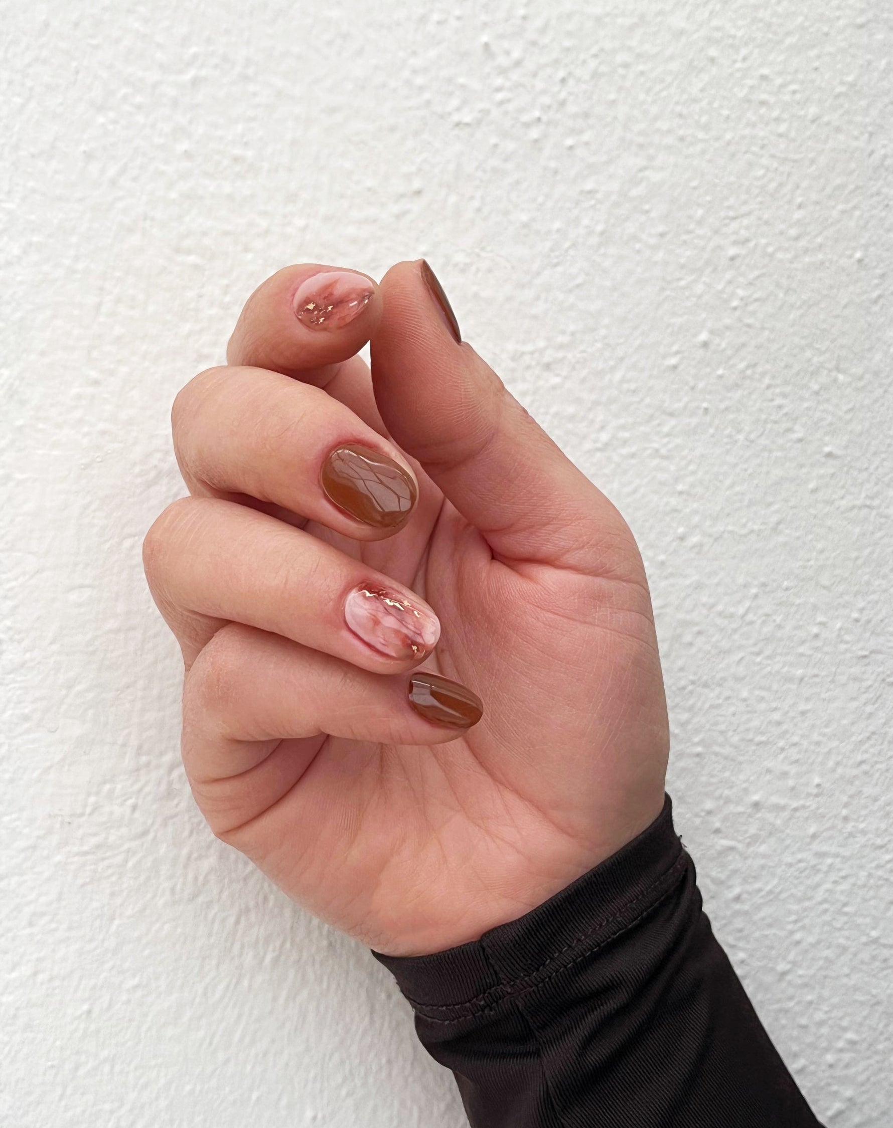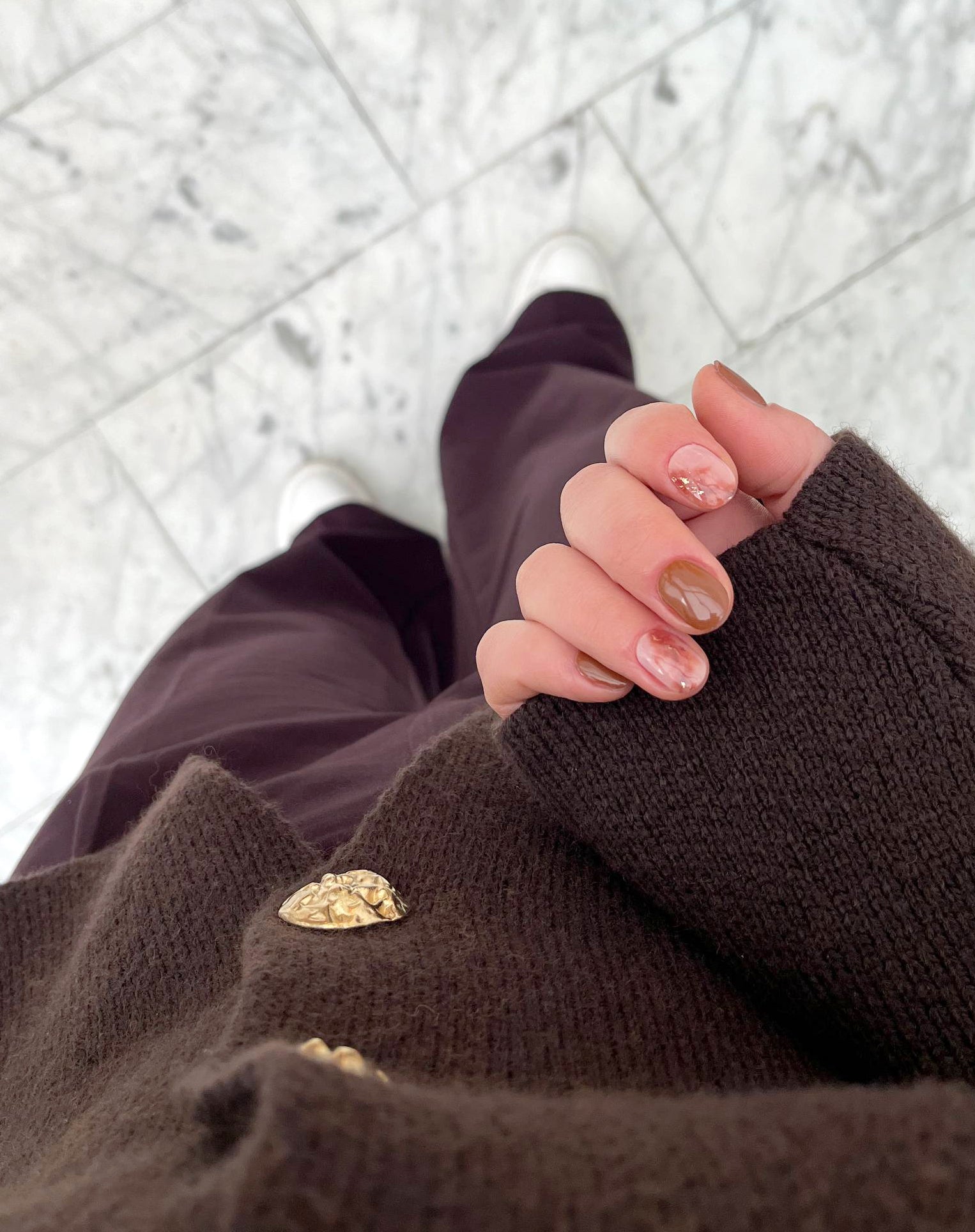 Perfect for those who love earth tones with a creative twist: the marbled detail with gold gives a precious touch without excess. Ideal for elegant, natural but never banal looks. A modern style choice.