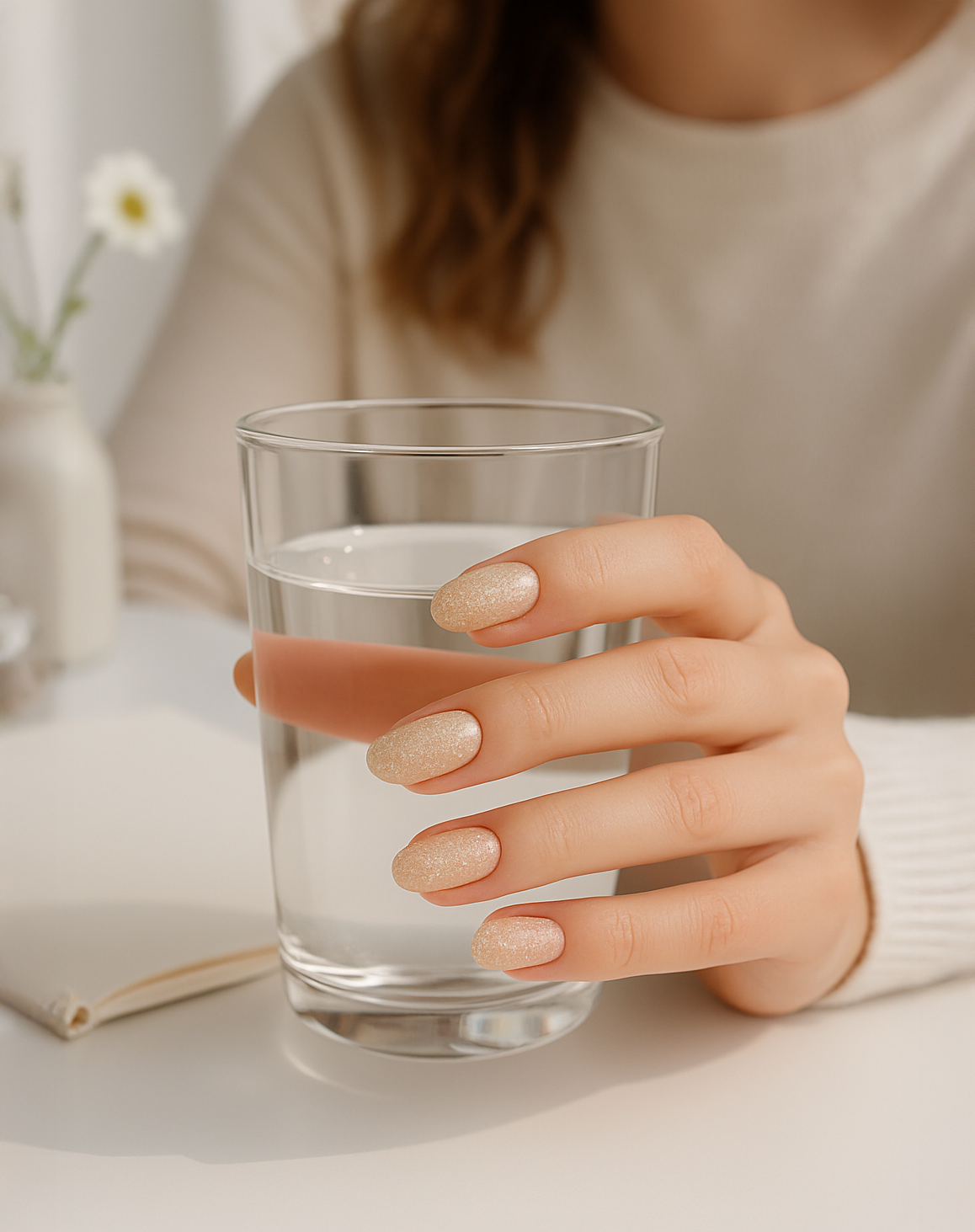 Un beige champagne arricchito da riflessi dorati e sparkling, per una manicure discreta ma preziosa. Perfetta per cerimonie, serate eleganti o per chi ama brillare con classe ogni giorno. Un tocco raffinato che veste le mani con luce e leggerezza.